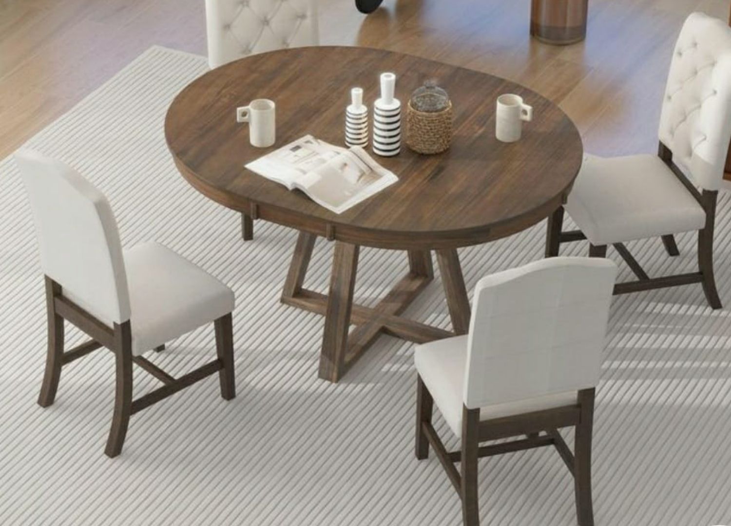 Simplify your dining area with the Minimalist 4-Seater Round Dining Table Set. Its compact round table and four sleek chairs create an inviting atmosphere, ideal for small spaces. Crafted with a durable wood finish, this set offers both style and practicality.